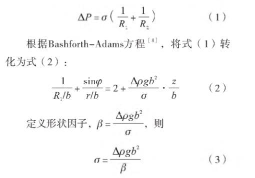 座滴法是基于熔體(液體)在水平托板表面形成穩(wěn)定橢球液滴的形狀參數(shù)測量表面張力的方法[6]?;谧畏y量玻璃熔體表面張力,玻璃熔體在水平托板上受重力和表面張力共同作用形成旋轉(zhuǎn)軸對稱橢球[7](圖1),橢球表面任一點(diǎn)的壓力差與表面張力之間的數(shù)學(xué)關(guān)系見式(1):