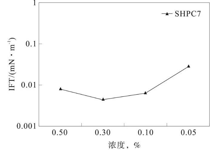為進(jìn)一步驗(yàn)證SHPC7濃度大小對(duì)界面張力的影響,從而為后續(xù)的驅(qū)油效果奠定基礎(chǔ),設(shè)置0.05%、0.10%、0.30%和0.50%四種不同的濃度。同樣采用Texas-500C界面張力儀對(duì)不同濃度下的界面張力進(jìn)行測(cè)定。通過(guò)實(shí)驗(yàn)可以得到圖3的界面張力變化情況。