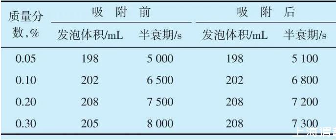 配制質(zhì)量分?jǐn)?shù)為0.05%,0.10%,0.20%和0.30%的磺基甜菜堿泡沫劑,再分別充入純度為99.9%的氮?dú)?,利用羅氏泡沫儀測試氮?dú)馀菽w系吸附前后的泡沫性能。評價結(jié)果(表1)表明,當(dāng)溫度為80℃時,不同質(zhì)量分?jǐn)?shù)的氮?dú)馀菽w系在吸附前后發(fā)泡體積均保持在200 mL左右,半衰期大于5 000 s,表明均具有良好的起泡性能和穩(wěn)定性能。