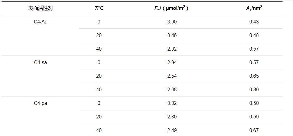 通常較高的?!藓洼^低的AS值表明表面活性劑分子密集地排列在空氣與水的界面上,由上述公式計算得到三種表面活性劑的?!藓洼^低的AS值如表2所示。對比參數(shù)可知,同種表面活性劑的Γ∞均隨溫度的升高而減小,AS有所增大,吸附表面的分子排布較為松散。這是由于溫度較高的情況下表面活性劑分子熱運動加劇,更易從吸附界面上脫離,并且因無規(guī)則運動導(dǎo)致吸附分子所占面積增大了。溫度升高導(dǎo)致溶解度的增加,因而表面的Γ∞會有所減小。由于?!捱€受到表面張力隨濃度變化曲線斜率的影響,因此所得趨勢是綜合影響的結(jié)果。此外,由表中還可以看出,C4-sa分子的?!拮钚?,AS最大,在溶液表面的排列更加松散。這可能是由于親水端磺酸基團之間強靜電排斥力,并且空間位阻較大。
