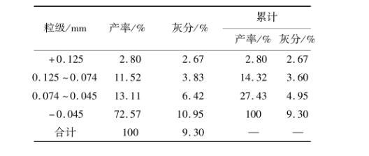 依據(jù)GB/T447—2008《煤炭篩分試驗(yàn)方法》對(duì)煤樣進(jìn)行小篩分試驗(yàn),浮選精煤樣品粒度組成見表2。由表2可以看出,煤樣中細(xì)粒物料含量非常高,其中-0.045 mm粒級(jí)產(chǎn)率高達(dá)72.57%,而+0.125 mm粒級(jí)產(chǎn)率僅有2.8%。該煤樣粒度細(xì),比表面積大,脫水時(shí)煤粒之間由于毛細(xì)作用存在大量毛細(xì)水,而且煤表面還存在大量的吸附水,難以通過機(jī)械力進(jìn)行有效脫除。此外,樣品中細(xì)粒含量高、粗粒含量少也會(huì)造成脫水過程中顆粒之間供水穿透的孔隙較少,脫水阻力較大。