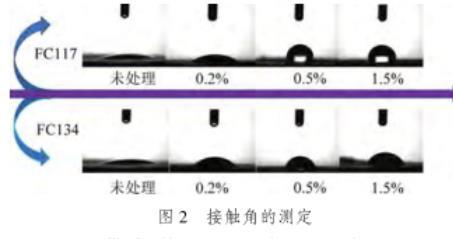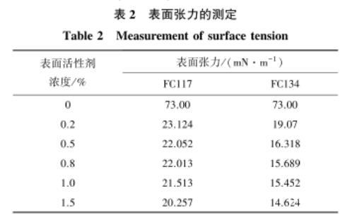 由表2可知,隨著FC117和FC134兩種表面活性劑溶液濃度的增加,溶液的表面張力先迅速降低,再逐漸趨于穩(wěn)定。當(dāng)表面活性劑濃度從0增加至0.2%時(shí),表面張力從初始的73 mN/m分別降至23.124 mN/m和19.07 mN/m,表面張力大幅度地降低;當(dāng)表面活性劑濃度從0.2%增加至1.5%時(shí),表面張力變化幅度較小,保持著較小程度的降低,并趨于穩(wěn)定。