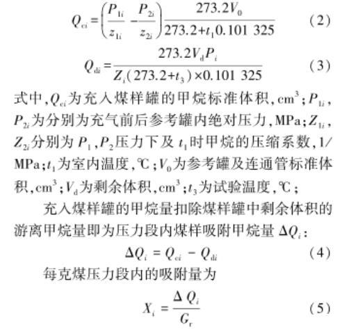 充入煤樣罐的甲烷量扣除煤樣罐中剩余體積的游離甲烷量即為壓力段內(nèi)煤樣吸附甲烷量ΔQi: