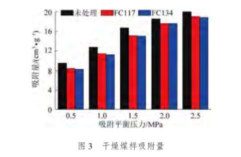 由圖3可知,隨著甲烷吸附平衡壓力的增加,氣潤(rùn)濕反轉(zhuǎn)劑處理前后煤樣的吸附量均逐漸增加,且增加量均呈現(xiàn)逐漸減小趨勢(shì)。經(jīng)過氣潤(rùn)濕反轉(zhuǎn)劑FC117和FC134處理后的煤樣吸附量始終小于未處理的煤樣。其中,產(chǎn)生該現(xiàn)象的原因主要為:一方面,氣潤(rùn)濕反轉(zhuǎn)劑分子自身占有一定的體積,隨水溶液一同進(jìn)入煤體內(nèi)部。在干燥過程中,水分通過蒸發(fā)作用排出煤體,而氣潤(rùn)濕反轉(zhuǎn)劑分子則滯留在煤體內(nèi)部,進(jìn)而減小甲烷分子的吸附空間;另一方面,氣潤(rùn)濕反轉(zhuǎn)劑具有低表面張力的特性,在吸附在煤體內(nèi)部孔隙裂隙的表面,降低其表面自由能,減小對(duì)甲烷分子的吸附能力,進(jìn)而使得吸附量下降。