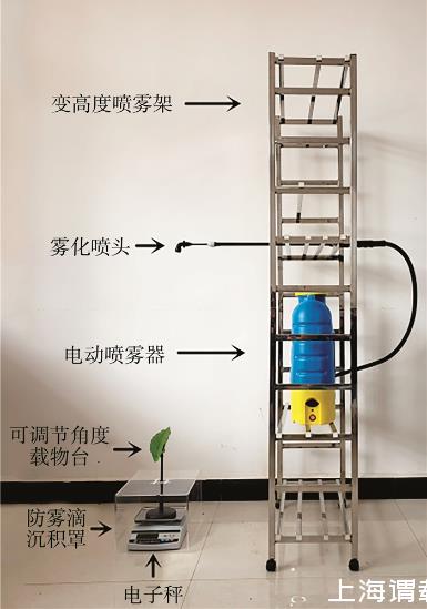 流失點和最大穩(wěn)定持留量的測定裝置見圖2。將噴霧器固定在可變高度噴霧架上,噴頭與地面垂直,分別設置噴嘴下沿與葉片中心垂直距離50、100、150和200 cm 4種噴霧距離,噴霧器中裝入水,進行噴霧時關閉靜電功能。測定裝置由載物臺、電子秤和防霧滴沉積罩3部分組成。其中載物臺可進行90°以內的傾斜角度調整;電子秤精度為0.01 g(YH-50002型,東陽市英衡智能設備有限公司);防護罩為透明的亞克力材料制成,防止霧滴沉積到電子秤上。