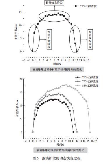 實(shí)驗(yàn)1探究液滴擴(kuò)散的動(dòng)態(tài)演變過程就是將前文用文字性描述的液滴擴(kuò)散現(xiàn)象定量處理,用數(shù)據(jù)清晰的看出液滴爆炸過程中擴(kuò)散半徑隨時(shí)間的變化,如圖6所示,可以從折線圖中直觀看出液滴爆炸的三個(gè)過程。