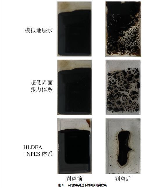 超低界面張力體系具有一定的潤濕調控性能,可以剝離44.2%的表面油膜,但其油膜剝離效率較差,剝離油膜僅在局部發(fā)揮作用,未能實現(xiàn)油膜的整體剝離,剝離后表面殘余油膜呈斑點狀。HLDEA+NPES體系的油膜剝離效率(75.3%)遠高于模擬地層水(24.8%)和超低界面張力體系(44.2%)。HLDEA+NPES體系中HLDEA分子作用于油固界面,改變親油表面潤濕性,有利于油膜收縮;NPES分子作用于油水界面,改變了油水界面的性質,使得油滴容易變形并脫離玻璃表面,降低了油滴的形變阻力,提高了油膜剝離率。