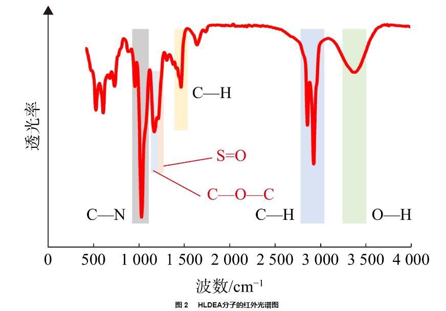 紅外光譜中峰的位置及形狀與分子中鍵的種類和環(huán)境具有對應關系,通過分析所得譜圖可得到物質的化學和結構組成的相關信息。圖2所示為HLDEA分子的紅外光譜圖。由圖2可知,合成后的HLDEA在3354.44 cm?1處出現(xiàn)O—H鍵的伸縮振動峰,2921.96 cm?1和2852.77 cm?1處的雙峰代表C—H鍵的伸縮振動峰,1463.05 cm?1處出現(xiàn)C—H鍵的彎曲振動峰,1028.50 cm?1處出現(xiàn)C—N鍵的伸縮振動峰,1215.97 cm?1處出現(xiàn)了S=O鍵的伸縮振動峰及1168.25 cm?1處C—O—C鍵的伸縮振動峰。C—O—C鍵和S=O鍵對應的振動峰來自生成的醚鍵和引入的磺酸根,這兩處峰的存在證明了反應成功發(fā)生,磺酸基團被接到LDEA分子上。