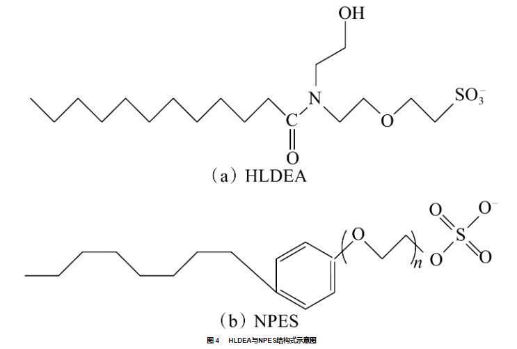 將配制好的穩(wěn)定性優(yōu)異的復配體系[0.15%(w)HLDEA+0.15%(w)助表面活性劑]置于75℃條件下,測定復配體系的油水界面張力,結果見圖3。由圖3可得,復配后體系油水界面張力隨時間均出現(xiàn)先下降后基本保持平衡的趨勢。HLDEA與兩種陰非離子型表面活性劑APEC-4Na和NPES復配后體系的油水界面張力降低至接近超低界面張力水平(10?3 mN·m?1)。這是因為HLDEA分子小、親油性高,其擴散速度快且傾向于進入油滴內部,同時,溶液中的NPES分子隨時間推移逐步被吸引于油水界面,尾鏈與HLDEA分子相互糾纏形成緊密結構,提高了油水界面吸附膜的致密程度,從而使界面張力大幅降低。最終優(yōu)選出的助表面活性劑為NPES,在與HLDEA復配后體系界面張力值為3.8×10?3 mN/m。HLDEA與NPES結構式見圖4。作為對比的超低界面張力體系油水界面張力值為2.9×10?4 mN/m,較HLDEA+NPES體系界面張力低了一個數量級。