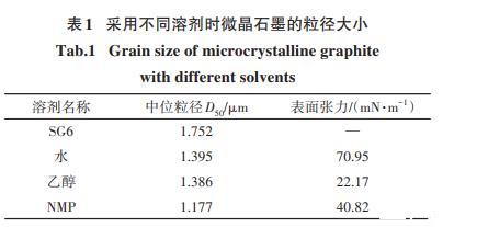 從熱力學(xué)角度考慮,固液兩相相近的表面能可降低二者之間的混合焓,所以采用石墨表面能相似的球磨溶劑可以提高其剝離效率。Teng等和Deng等以石墨為原料,用球磨法制備石墨烯時(shí)發(fā)現(xiàn),采用表面能與石墨相近的1-甲基~2-吡咯烷酮(NMP)(40.8 mN·m-1)作為球磨溶劑具有較好的剝離效果?;诖耍竟ぷ鞑捎貌煌砻鎻埩Φ娜軇┳鳛榍蚰ソ橘|(zhì),在球磨時(shí)間為24 h,球料比為12∶1,漿料濃度為25%,球磨速度為350 r/min的條件下進(jìn)行球磨,結(jié)果如表1所示。從表中可看出NMP作為球磨溶劑時(shí),微晶石墨中位粒徑最小。由此說明,NMP與微晶石墨的表面能相近,對微晶石墨的剝離效率高。但是NMP存在價(jià)格昂貴、環(huán)境污染大的缺點(diǎn),因此尋求一種環(huán)境友好、成本低的球磨溶劑對微晶石墨細(xì)化產(chǎn)業(yè)化具有重要的意義。