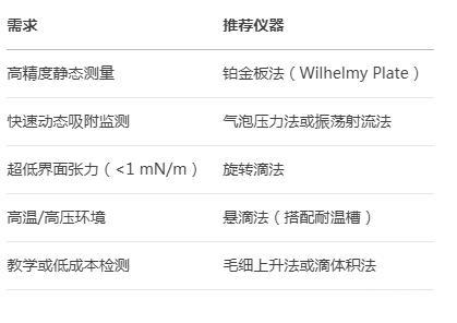 樣品性質(zhì):高粘度液體適合懸滴法或旋轉(zhuǎn)滴法,易揮發(fā)液體需密閉測(cè)量(如氣泡壓力法)。