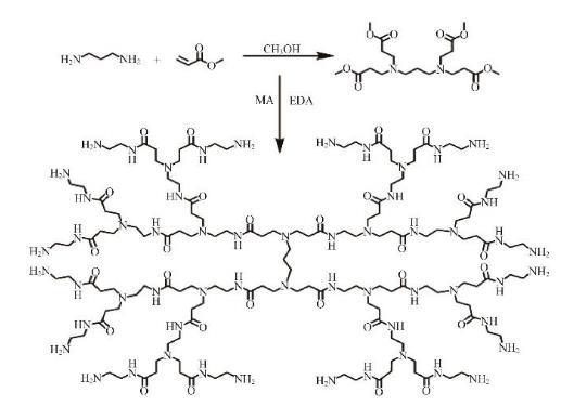 以1,3-丙二胺為反應中心核,丙烯酸甲酯和乙二胺為支鏈,通過“一鍋法”合成h-PAMAM。具體的反應過程可以分為以下幾步,首先將30 mL甲醇加入到三口燒瓶中,向其中加入1,3-丙二胺(0.1 mol),邊攪拌邊滴加丙烯酸甲酯(0.4 mol),隨后混合物在25℃下繼續(xù)攪拌反應24 h。然后依次將乙二胺(0.28 mol)和丙烯酸甲酯(0.24 mol)滴加入燒瓶中,繼續(xù)反應24 h。最后,在真空狀態(tài)下采用程序升溫:60℃反應1 h,80℃反應1 h,100℃反應2 h,120℃反應2 h,140℃反應2 h。最終得到淺綠色、高黏度的樣品。合成路線如圖1所示。
