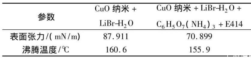 為了便于觀察3種表面活性劑對(duì)納米LiBr——H2O表面張力和沸騰溫度的影響,實(shí)驗(yàn)測(cè)量了不含此3種表面活性劑的納米LiBr——H2O的表面張力和沸騰溫度,見表1。
