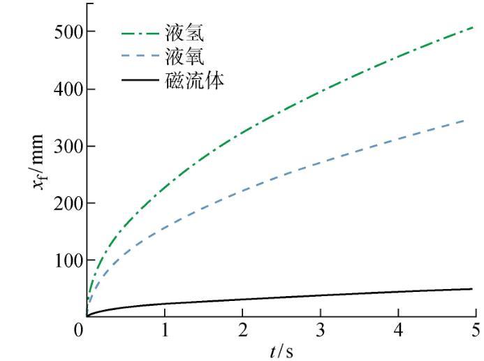圖2為在τ=0.1,R=6×10-3m,α=15°的內(nèi)角條件下,液氫、液氧以及磁流體的毛細(xì)爬升距離隨時(shí)間的變化曲線。由圖可見,液氫與液氧的流動(dòng)速度均顯著高于前文實(shí)驗(yàn)中的磁流體,且液氫的運(yùn)動(dòng)速度高于液氧。其原因在于盡管低溫推進(jìn)劑的表面張力較小,但由于其黏滯系數(shù)同樣較小,因子σ/μ反而增大;且上述兩種流體對(duì)不銹鋼有很好的潤濕效果,最終導(dǎo)致爬升能力的提高。此外,對(duì)于上述兩種低溫推進(jìn)劑,液氫的表面張力以及黏度均小于液氧,但由于黏度對(duì)流動(dòng)的作用更顯著,所以液氫的運(yùn)動(dòng)速度始終高于液氧。