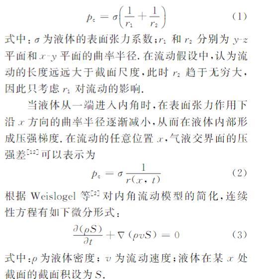 式中:σ為液體的表面張力系數(shù);r1和r2分別為y-z平面和x-y平面的曲率半徑。在流動(dòng)假設(shè)中,認(rèn)為流動(dòng)的長(zhǎng)度遠(yuǎn)遠(yuǎn)大于截面尺度,此時(shí)r2趨于無窮大,因此只考慮r1對(duì)流動(dòng)的影響。