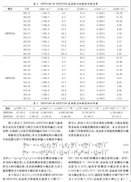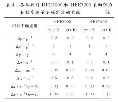 表4給出了式(11)、(12)中各參數(shù)對(duì)HFE7000和HFE7200表面張力和黏度在溫度上下限(T=293~393 K)的擴(kuò)展測量不確定度的貢獻(xiàn)。其中,兩種物質(zhì)在T=293 K時(shí),表面張力擴(kuò)展測量不確定度為0.33%,黏度擴(kuò)展測量不確定度分別為1.04%和1.03%;當(dāng)T=393 K時(shí),表面張力擴(kuò)展測量不確定度為0.33%,黏度擴(kuò)展測量不確定度分別為1.35%和1.13%;表面張力的不確定度保持不變,隨著溫度的升高,黏度測量的擴(kuò)展測量不確定度升高。越接近臨界溫度,氣相密度和黏度對(duì)擴(kuò)展測量不確定度的貢獻(xiàn)越大。因此,本文HFE7000和HFE7200表面張力的擴(kuò)展測量不確定度(置信因子k=2)估計(jì)為0.35%,黏度的擴(kuò)展測量不確定度(k=2)分別估計(jì)為1.35%和1.13%。