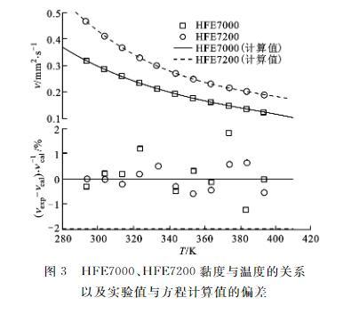 圖3給出了HFE7000、HFE7200黏度與溫度的關(guān)系以及實(shí)驗(yàn)值與擬合方程計(jì)算值的偏差,結(jié)果表明,實(shí)驗(yàn)值與方程計(jì)算值的偏差均在±2%之內(nèi)。