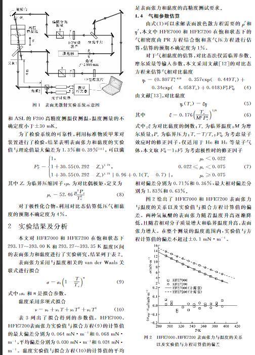 本文利用新搭建的表面光散射實(shí)驗(yàn)系統(tǒng)測量了兩種氫氟醚類物質(zhì)HFE7000和HFE7200在飽和狀態(tài)下的表面張力和黏度,溫度范圍均為293~393 K。利用獲得的數(shù)據(jù),擬合了表面張力和黏度的關(guān)聯(lián)式。HFE7000和HFE7200表面張力實(shí)驗(yàn)值與關(guān)聯(lián)式計(jì)算值的平均偏差分別為0.030 mN·m-1和0.024 mN·m-1;HFE7000和HFE7200黏度實(shí)驗(yàn)值與關(guān)聯(lián)式計(jì)算值的平均相對(duì)偏差分別為0.71%和0.36%。