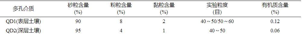 本研究選用的兩種多孔介質(zhì)分別為QD1(表層20~40cm土壤)和QD2(地下50~100cm深層土壤),均采自青島市嶗山區(qū)某農(nóng)田。經(jīng)過(guò)自然風(fēng)干后,將其篩分為40~50目和50~60目。實(shí)驗(yàn)選用土壤中的金屬氧化物含量均較低,主要差異為有機(jī)質(zhì)含量。土壤樣品的性質(zhì)見(jiàn)表1。