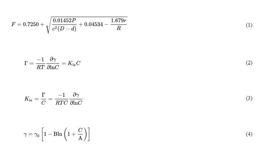 實(shí)際表面張力(γ)由儀器表面張力讀數(shù)(P)、校正因子(F)和實(shí)驗(yàn)相關(guān)常數(shù)相乘得到。校正因子計(jì)算如公式(1)所示;氣-水界面吸附系數(shù)通過(guò)Gibbs吸附等溫方程得到,見(jiàn)公式(2)和公式(3);將Szyszkowski方程應(yīng)用于表面張力數(shù)據(jù),見(jiàn)公式(4),該方程提供了一種計(jì)算數(shù)值的統(tǒng)一方法。