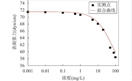 在0.01mol/L氯化鈉溶液中測量所得的6∶2氟調(diào)磺酸表面張力如圖1所示,圖中實(shí)心點(diǎn)表示同一濃度下表面張力的實(shí)際平均值,曲線是基于Szyszkowaki方程擬合所得。利用該方程擬合的相關(guān)參數(shù)A和B的值分別為12.70和0.075。實(shí)驗(yàn)結(jié)果顯示實(shí)測數(shù)據(jù)點(diǎn)與擬合曲線偏移量較小,這證實(shí)了Szyszkowaki方程對本實(shí)驗(yàn)體系的表面張力數(shù)據(jù)具有良好的擬合效果。