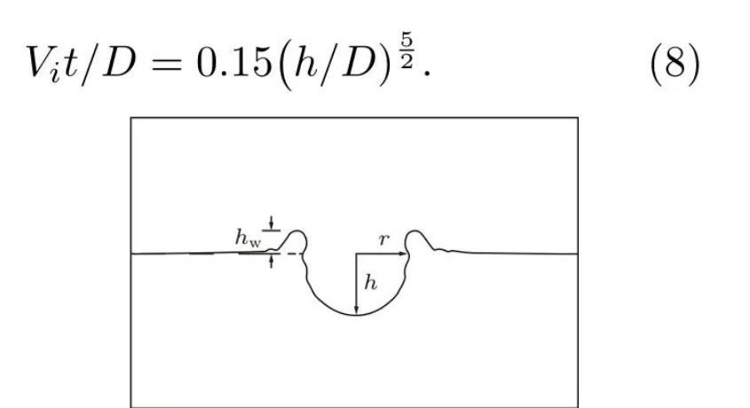 3)液滴撞擊深水液池后,空腔深度先以較快速度增長,在到達(dá)最大空腔深度后快速回彈,至接近原自由液面后速度逐漸放緩。在忽略毛細(xì)波作用、空腔深度為h=D至h=hmax范圍內(nèi)的前提下,空腔深度隨時(shí)間的成長關(guān)系可由(Vit)/D=0.15(h/D)5/2來描述,但最終空腔底部的形成是由毛細(xì)波運(yùn)動(dòng)決定的;空腔寬度的增長主要由毛細(xì)波運(yùn)動(dòng)及其干擾驅(qū)動(dòng),最后在慣性力作用下線性增長。