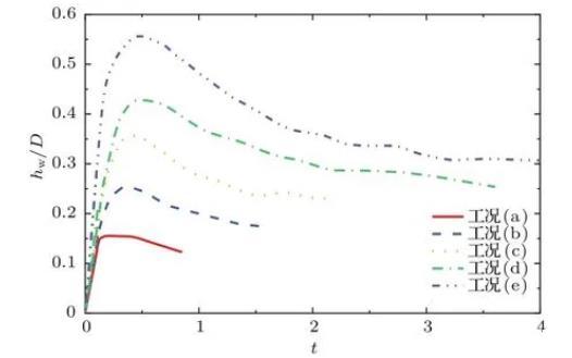 圖7及圖8分別為不同工況下波浪隆起高度hw和空腔寬度r隨時(shí)間的變化過程。由圖7易得,水滴撞擊水池后波浪高度的變化過程也經(jīng)歷了從快速增長到逐漸回落,最終在慣性力的作用下自主運(yùn)動(dòng),趨于穩(wěn)定的過程。隨著弗勞德數(shù)的增大,更大的垂向速度在創(chuàng)造更深空腔的同時(shí)激發(fā)了更高的最大波浪隆起高度。從圖8可以看出,空腔寬度的增長與波浪的運(yùn)動(dòng)息息相關(guān),在撞擊產(chǎn)生的動(dòng)能與波浪自身重力勢(shì)能基本耗散后,空腔運(yùn)動(dòng)主要由毛細(xì)波及其干擾驅(qū)動(dòng),最后在慣性下線性增長。毛細(xì)波現(xiàn)象在圖8工況(e)的t=0.8時(shí)非常顯著,其周期在圖6的t=1.5—2.5中也有體現(xiàn)。