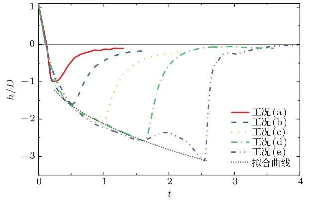 圖6為不同工況下空腔深度h隨時(shí)間的變化過程。由圖6可以看出,液滴撞擊深水液池后,由于動(dòng)能、空腔側(cè)壁隆起部分重力勢(shì)能以及表面張力能的驅(qū)動(dòng),空腔深度先以較快速度增長,其后增勢(shì)逐漸放緩,在到達(dá)最大空腔深度后快速回彈,至接近原自由液面后回彈速度逐漸放緩,近乎趨于直線。弗勞德數(shù)的增加對(duì)空腔深度變化影響顯著,在工況(a)中,弗勞德數(shù)僅為117.2,空腔能量耗散時(shí)程較短,回復(fù)較為迅速,隨著弗勞德數(shù)的增大,撞擊動(dòng)能增大,回復(fù)時(shí)程也逐漸增加。值得注意的是,在工況(e)中,由于空腔形狀由U形轉(zhuǎn)變?yōu)榻铺菪?,空腔在t=1.5—2.6時(shí)先緩慢上升,隨后毛細(xì)波向空腔底部傳遞,促使其底部變?yōu)閳A柱形,且深度繼續(xù)增加,最后空腔底部側(cè)壁坍塌形成射流,因此在t=2.6后空腔回復(fù)速度較其他工況更為迅速。將數(shù)值結(jié)果運(yùn)用最小二乘法擬合,得到的擬合曲線表達(dá)式如(8)式所示,該式能夠在忽略毛細(xì)波運(yùn)動(dòng)的前提下,在空腔深度為h=D至達(dá)到最大深度的范圍內(nèi)較好地描述了空腔深度隨時(shí)間的成長關(guān)系,Liow等與Ray等對(duì)液滴撞擊運(yùn)動(dòng)中時(shí)間與空腔深度的關(guān)系進(jìn)行了建模,得出與本文相似的結(jié)論: