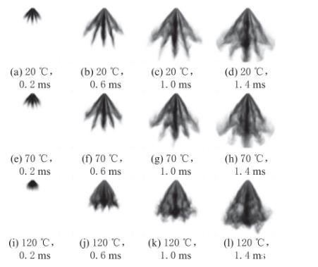 圖6不同環(huán)境溫度和噴霧開始后時(shí)刻下正丁醇的噴霧形態(tài)