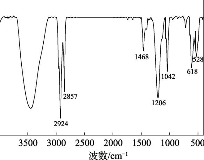 圖1為TAC的FTIR譜圖。從圖1可以看出,2924 cm–1處為主鏈甲基的C—H鍵的伸縮振動吸收峰;2857 cm–1處為主鏈亞甲基C—H鍵的伸縮振動吸收峰;1468 cm–1處為甲基和亞甲基C—H鍵的面內(nèi)搖擺振動吸收峰;1206 cm–1為磺酸基團中C—S鍵的不對稱伸縮振動吸收峰;1042 cm–1處為胺基C—N鍵的面內(nèi)彎曲振動吸收峰,表明TAC結(jié)構(gòu)中存在季銨基。618和528 cm–1處為—SO 3-的中強吸收峰,表明TAC結(jié)構(gòu)中存在磺酸基。上述結(jié)果表明,TAC符合預先設(shè)計的結(jié)構(gòu)。
