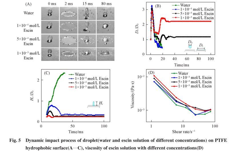 液滴在固體表面的彈跳行為由液體性質(zhì)和固體表面性質(zhì)共同決定,通常對(duì)于特定場(chǎng)景,固體表面性質(zhì)多是固定不變的,因此主要通過改變液體的性質(zhì)(黏度、表面張力)來調(diào)控液滴的彈跳行為.為了考察七葉皂素抑制液滴回縮過程中,液體黏度是否起到一定作用,測(cè)定了水和不同濃度七葉皂素溶液的黏度.如圖5(D)所示,所有樣品的黏度隨剪切速率的增加會(huì)先下降后達(dá)到平衡,不同樣品的黏度結(jié)果相似,無明顯差異。
