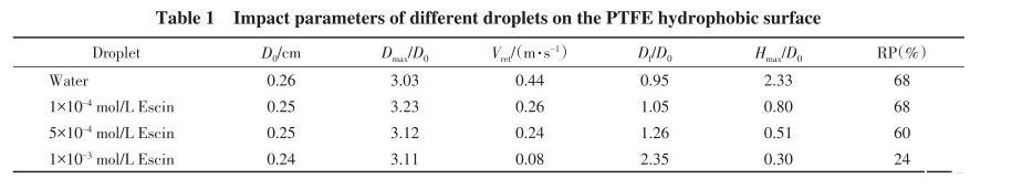 從圖5(B)和(C)及表1可以看出,不同液滴在疏水表面上發(fā)生撞擊后均發(fā)生相似程度的鋪展,之后發(fā)生回縮.水滴回縮速率(0.44 m/s)較大,且回縮百分比達(dá)到68%.向水中加入少量七葉皂素,濃度為1×10-4mol/L時(shí),回縮速率(0.26 m/s)明顯降低,但回縮百分比沒有明顯改善.隨著七葉皂素濃度增大,液滴回縮明顯減弱.濃度為1×10-3mol/L時(shí),回縮速率低至0.08 m/s,且僅液滴的24%發(fā)生回縮,可以認(rèn)為達(dá)到了很好的抑制回彈的效果.而考察彈跳情況時(shí)發(fā)現(xiàn),水滴因完全彈起離開表面,所以Hmax/D0最高達(dá)到2.33.與之相比,七葉皂素加入后,明顯抑制了液滴的彈起,且隨著濃度增大,抑制作用明顯增加.