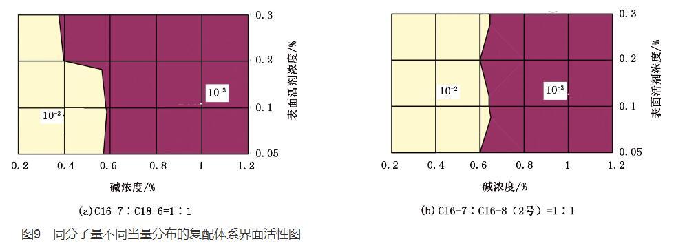 2)同分子量不同當(dāng)量分布的表面活性劑界面活性范圍從圖8和圖2對比可以得出,表面活性劑平均相對分子量為432時(shí),C18-6測得表面活性劑與堿濃度范圍很寬的超低界面活性范圍,而C16-8(2號)超低界面活性范圍的堿濃度相對于C18-6變窄。同理,在試驗(yàn)用表面活性劑的復(fù)配體系中,試驗(yàn)圖9表明平均相對分子量為425時(shí),C16-7與C18-6的復(fù)配體系形成超低界面活性范圍寬于C16-7與C16-8(2號)的復(fù)配體系。說明平均相對分子量相同當(dāng)量分布不同的表面活性劑界面活性范圍也不相同。