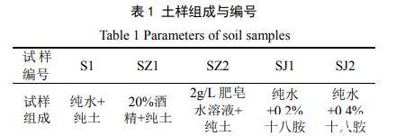 試驗用土取自云南省境內昆曲高速公路嚴家山段,為淺灰色弱膨脹土,其自由膨脹率為55.7%,液限為41%,塑限為20.3%。取回的土樣經(jīng)過風干、碾碎后過2 mm的篩備用。為研究氣–液界面張力對膨脹土干縮開裂的影響,采用3種不同表面張力的液體作為土中的液相,分別為:純水、體積百分數(shù)為20%的酒精溶液和含量為2 g/L的肥皂水;通過在土體中混合斥水劑的方法配制不同接觸角的土樣,斥水劑十八烷基伯胺(C18H39N),簡稱:十八胺,為堿性白色蠟狀粉末,純度為99%,配制兩種斥水土樣,十八胺含量分別為:0.2%和0.4%。各土樣的成分和編號如表1所示。