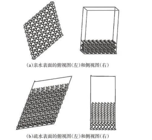 SiO2(001)元胞表面羥基化后,用十八烷基三氯硅烷(OTS)取代羥基進(jìn)行硅烷化處理,并通過構(gòu)建超胞得到擴(kuò)展表面。為消除周期邊界條件的影響,在表面添加35?真空層,得到SiO2疏水表面初始模型。優(yōu)化后的疏水表面結(jié)構(gòu)如圖1(b)所示,OTS的長鏈烷基在表面呈輕微傾斜的垂直規(guī)律排布。