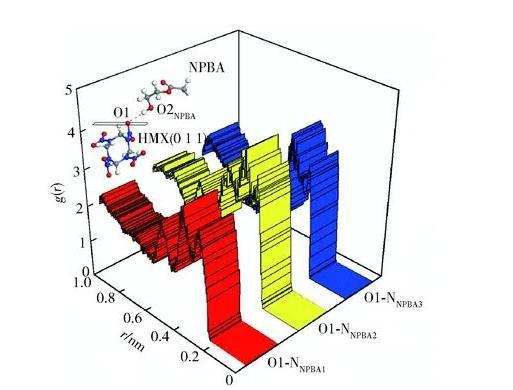 HMX(0 1 1)晶面上—NO2基團(tuán)中氧原子O1與NPBA分子鏈上—CN基團(tuán)上氮原子NNPBA之間的徑向分布函數(shù)曲線見圖3.