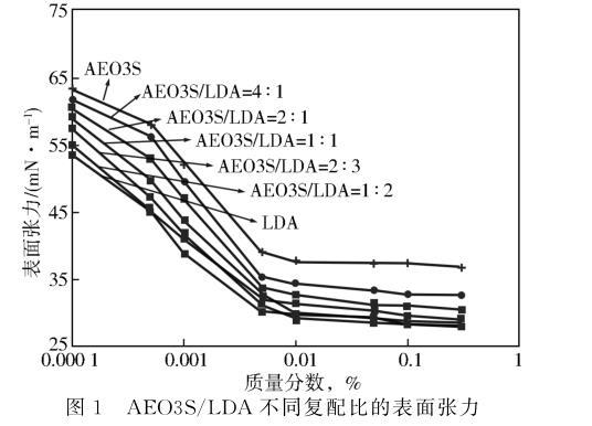 圖1 AEO3S/LDA不同復(fù)配比的表面張力