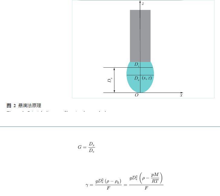 筆者采用懸滴法進行水與瓦斯之間表面張力的測試,當水滴被靜止懸掛在毛細管的管口處時,液滴的外形主要取決于重力和表面張力的平衡,通過對水滴外形的測定獲得水與瓦斯之間表面張力計算的相關(guān)參數(shù)。懸滴法原理圖如圖2所示,采用自開發(fā)的水與瓦斯之間界面張力分析軟件獲得式(1)中Ds、De,聯(lián)合水、瓦斯的密度、修正后的形狀因子(F)、重力加速度(g),基于式(2)計算水與瓦斯之間的表面張力。