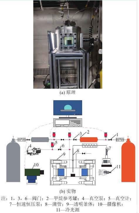 含瓦斯煤與水之間接觸角測試設(shè)備具備抽真空、充氣吸附、恒溫控制、滴水、光學(xué)成像及自動采集數(shù)據(jù)的功能,設(shè)備的實物圖及原理分別如圖1a—圖1b所示。