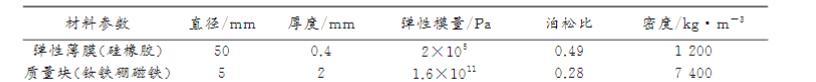 研究對(duì)象MAMs結(jié)構(gòu):彈性薄膜中心兩面粘結(jié)圓形質(zhì)量塊。薄膜采用硅橡膠,通過勻膠機(jī)制備:按硅膠與固化劑100:3比例混合,低速檔(500 rpm,30s)甩開膠液,高速檔(1000 rpm,30s)均勻涂布于硫酸紙基底,靜置30min后剝離得到。高速檔轉(zhuǎn)速不同會(huì)導(dǎo)致薄膜厚度不同(如表1不同轉(zhuǎn)速所得薄膜厚度,具體值因排版缺失未完整顯示)。實(shí)驗(yàn)中,薄膜制備厚度為0.4 mm。質(zhì)量塊采用釹鐵硼磁鐵。材料參數(shù)詳見表2。