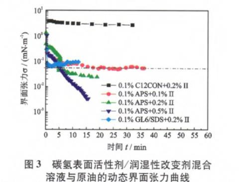圖3為典型的碳?xì)浔砻婊钚詣?潤濕性改變劑混合溶液與原油的動(dòng)態(tài)界面張力曲線。從圖3可以看出,0.1%C12CON+0.2%Ⅱ型潤濕性改變劑、0.1%GL6/SDS(混合質(zhì)量比為4∶1)+0.2%Ⅱ型潤濕性改變劑混合溶液與原油的界面張力分別為2.573 2 mN/m和0.063 5 mN/m,但0.1%APS+0.2%Ⅱ型潤濕性改變劑混合溶液與原油的界面張力可以達(dá)到0.024 6 mN/m。而且,0.1%APS+0.1%Ⅱ混合溶液與原油的界面張力也低于0.05 mN/m,0.1%APS+0.5%Ⅱ型潤濕性改變劑混合溶液與原油的界面張力甚至可以達(dá)到小于0.003 5 mN/m的超低界面張力。