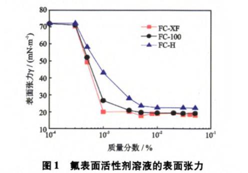 本研究的目的是獲得具有低表/界面張力且與巖石達(dá)到近似于中性潤濕的助排劑。首先,需要選擇表面活性劑。表面活性劑溶液達(dá)到臨界膠束濃度(cmc)后的表面張力(γcmc)是該表面活性劑溶液能夠獲得的最低表面張力。根據(jù)常見表面活性劑的γcmc數(shù)據(jù),氟表面活性劑能夠使水溶液達(dá)到更低的表面張力。因此,在新型助排劑中將選用合適的氟表面活性劑以降低溶液的表面張力。其次,選擇潤濕性改變劑。要達(dá)到與巖石接近中性潤濕,需要調(diào)節(jié)助排劑在巖石表面的吸附作用,以改變巖石表面的性質(zhì)使助排劑體系與巖石潤濕接觸角在75°~105°間(90°±15°)。此外,由于氟表面活性劑和潤濕性改變劑一般只能使油水界面張力降低到1 mN/m以上,因此要借鑒化學(xué)驅(qū)提高采收率中能夠與原油達(dá)到超低界面張力的表面活性劑的選擇方法,復(fù)配合適的碳?xì)浔砻婊钚詣┮垣@得能夠同時(shí)降低界面張力的助排劑體系。
