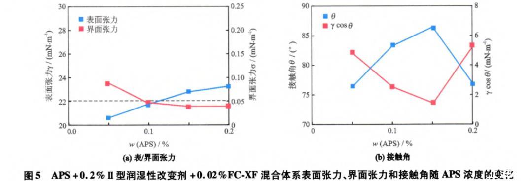 從圖5(a)中可以看出,隨著APS質(zhì)量分?jǐn)?shù)的增加,體系的表面張力增大,界面張力減小,這與FXCF對(duì)表/界面張力的影響機(jī)制相同。從圖5(b)中可以看出,隨著APS質(zhì)量分?jǐn)?shù)的增加,體系與巖石的接觸角先增加再減小,相應(yīng)的γcosθ先減小再增大,均出現(xiàn)極值點(diǎn),這與圖4(b)的變化趨勢(shì)不同。這是因?yàn)槲舰蛐蜐?rùn)濕性改變劑和FC-XF使得巖石表面由水濕轉(zhuǎn)變?yōu)槿跤H水性潤(rùn)濕(接觸角<75°),更易于吸附APS的親水頭基而使碳?xì)滏溤趲r石表面暴露,這降低了巖石表面的親水性,因而隨著APS質(zhì)量分?jǐn)?shù)的增加接觸角增大。但是,當(dāng)APS質(zhì)量分?jǐn)?shù)大于0.15%后,過多的APS分子可能在巖石表面發(fā)生雙分子層吸附或因競(jìng)爭(zhēng)吸附而降低Ⅱ型潤(rùn)濕性改變劑的吸附量,使得巖石表面的親水性增加。而且,接觸角的變化決定了γcosθ的變化趨勢(shì),因而接觸角和γcosθ隨APS質(zhì)量分?jǐn)?shù)的變化曲線中均出現(xiàn)極值點(diǎn)。