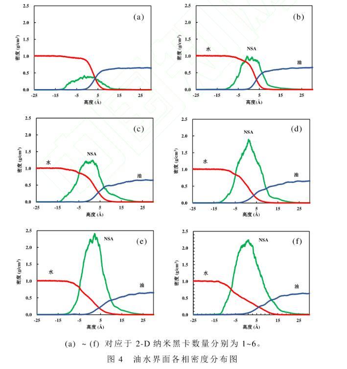 運用所構建的油水界面模型,研究2-D納米黑卡(NSA)在油水界面的密度分布及吸附行為,模擬結果如圖4所示。納米黑卡數(shù)量增加時,界面處油相密度變化幅度大。這是由于隨著納米黑卡數(shù)量的增加,接枝的直鏈烷烴與油相相互作用不斷增強所致。當體系達到平衡狀態(tài),納米片大部分浸沒在水相中,直鏈烷烴主要浸沒在油相中。此時,納米黑卡所處的平衡位置受到納米黑卡重力和分子間相互作用力的影響很大,分子間相互作用力包括范德華力和靜電力。納米片偏親油性,顯示出與油水分子間的弱范德華力,而直鏈烷烴與油相分子間存在強范德華力,因此納米片被拉向油相。隨著納米黑卡數(shù)量的增加,油水界面納米片的密度隨之增加。納米黑卡的密度在中線附近出現(xiàn)峰值,當納米黑卡數(shù)量增至4片后繼續(xù)增加黑卡數(shù)量,在中線部分納米黑卡的密度增加量并不明顯,只是高峰變寬了。