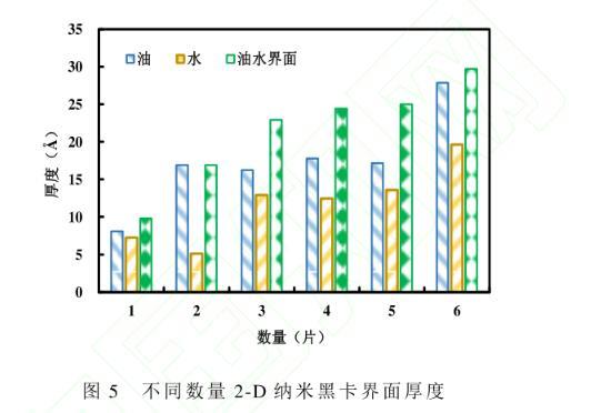 假設2-D納米黑卡全部平鋪在油水界面,其表面積與油水界面面積的比值即為界面覆蓋率(RIC)。不同數(shù)量的納米黑卡在油水體系中的界面覆蓋率和界面厚度見圖6。界面覆蓋率與界面厚度隨著納米黑卡數(shù)量的增加逐漸增加,且界面覆蓋率呈指數(shù)增加,而界面厚度呈對數(shù)增加,納米黑卡數(shù)量由1增至6時,界面覆蓋率分別為0.16、0.31、0.46、0.91、1.34和2.64。當納米黑卡數(shù)量增加到一定程度時(納米黑卡數(shù)量為4片),油水界面幾乎全部被覆蓋,界面覆蓋率在1左右,此時的界面厚度達到相對穩(wěn)定的狀態(tài),界面呈單層且平鋪吸附狀態(tài);當黑卡數(shù)量繼續(xù)增加,界面覆蓋率指數(shù)增加,界面厚度也隨之增加,此時納米片呈受擠壓狀態(tài),出現(xiàn)褶皺態(tài)和重疊疊加態(tài),繼續(xù)增加納米黑卡數(shù)量,界面達到飽和,界面厚度不再增加,多出的黑卡分散在水溶液中,由于黑卡本身存在弱范德華相互作用,片片間不斷疊加,成為團聚態(tài),從而形成沉淀。該沉淀物質(zhì)以弱范德華相互作用團聚在一起,當遇到剪切、稀釋、振蕩等外界作用時會重新分散在水溶液中,發(fā)揮其單片的作用。