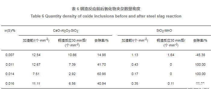 分析鋼渣反應(yīng)前后夾雜物的成分可知,重軌鋼中氧化物夾雜分為SiO2-MnO系和CaO-Al2O3-SiO2系兩類夾雜,圖8所示為兩類典型夾雜二維形貌。各類氧化物夾雜在鋼渣反應(yīng)前后數(shù)量密度變化見表6??梢钥闯觯撝兄饕獖A雜為鈣鋁硅酸鹽,因此鋼渣反應(yīng)30 min后,鈣鋁酸鹽的去除率同總氧化物夾雜的去除率相近,隨著氧、硫質(zhì)量分?jǐn)?shù)的增高,鈣鋁酸鹽的去除率呈升高的趨勢。由于鋼中硅錳夾雜數(shù)量較少,且掃描面積有限,僅從以上表格統(tǒng)計的數(shù)量密度不具代表性,因此其去除率未呈現(xiàn)明顯規(guī)律。