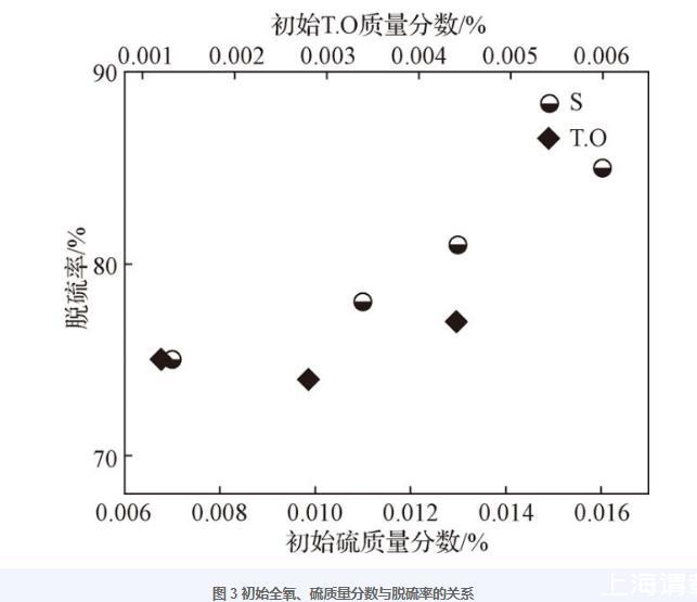 檢測每爐試樣1和試樣2的硫和全氧質(zhì)量分?jǐn)?shù),結(jié)果見表3。可以看出,固定鋼中全氧質(zhì)量分?jǐn)?shù),隨著初始硫質(zhì)量分?jǐn)?shù)的升高,鋼渣反應(yīng)30 min后,脫硫率逐漸增大,且穩(wěn)定在74%以上,終點硫質(zhì)量分?jǐn)?shù)可降低到0.002 6%以下;固定鋼中硫質(zhì)量分?jǐn)?shù),隨著初始全氧質(zhì)量分?jǐn)?shù)的升高,終點全氧質(zhì)量分?jǐn)?shù)可降低到0.001 4%以下,終點硫質(zhì)量分?jǐn)?shù)可降低到0.001 8%以下,皆滿足重軌鋼的成分要求。鋼中初始硫、全氧質(zhì)量分?jǐn)?shù)與脫硫率的關(guān)系如圖3所示。