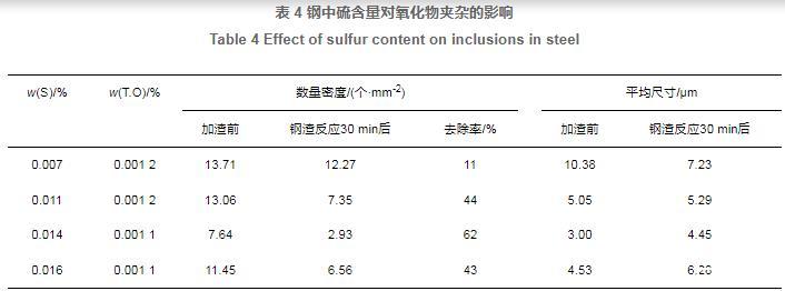 分析ASPEX全自動夾雜物分析儀掃描結(jié)果,定義MnS質(zhì)量分?jǐn)?shù)小于10%的夾雜物為氧化物夾雜。關(guān)注鋼渣反應(yīng)前后氧化物夾雜的數(shù)量密度和平均尺寸,統(tǒng)計結(jié)果見表4、表5和圖4~圖7??梢钥闯觯撝醒?、硫含量的提高對鋼渣反應(yīng)過程中氧化物夾雜去除有顯著的效果。隨著氧、硫質(zhì)量分?jǐn)?shù)增加,氧化物夾雜的去除率呈升高趨勢,平均尺寸呈減小趨勢。在氧質(zhì)量分?jǐn)?shù)為約0.001 2%的前提下,鋼中硫質(zhì)量分?jǐn)?shù)從0.007%上升到0.016%時,氧化物夾雜的去除率從10%上升到60%左右;在鋼中硫質(zhì)量分?jǐn)?shù)為0.007%的前提下,鋼中全氧質(zhì)量分?jǐn)?shù)從0.001 2%上升到0.004 4%,氧化物夾雜的去除率從10%上升到70%左右,氧化物夾雜的平均尺寸也呈減小趨勢。
