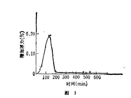 測試條件:水流速v=0.745m/s;水溫T=18.0±0.3℃;電場頻率3.5MHz;用長春市自來水。測試時(shí)間為1984年9月21日。電水的浮力和時(shí)間關(guān)系見圖3。