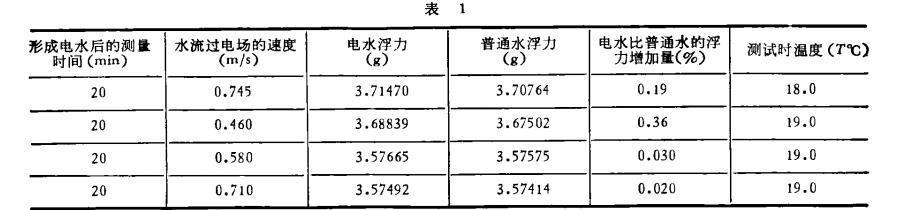用自制電水器形成電水,用精度為0.1mg的電光天平測定電水和普通水的浮力。實(shí)驗(yàn)用水是長春市自來水和深井水,測試時(shí)只要保證水溫和環(huán)境溫度穩(wěn)定,數(shù)百次實(shí)驗(yàn)證實(shí),電水浮力比普通水浮力增加,重復(fù)性規(guī)律較好。現(xiàn)選四組數(shù)據(jù)列于表1。
